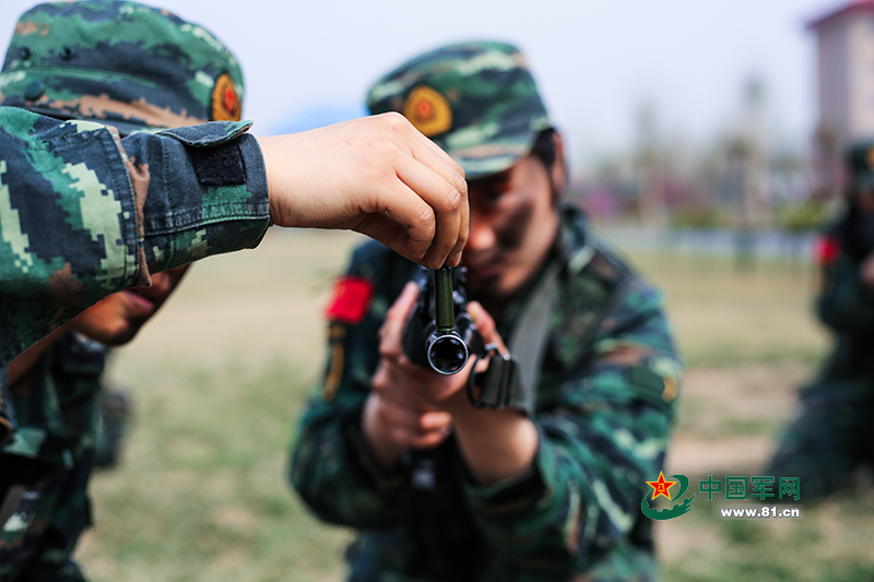 射击训练,教练班长正在往特战队员的枪口上放置子弹壳,以此提升据枪的稳定性。 蓝惟东摄
