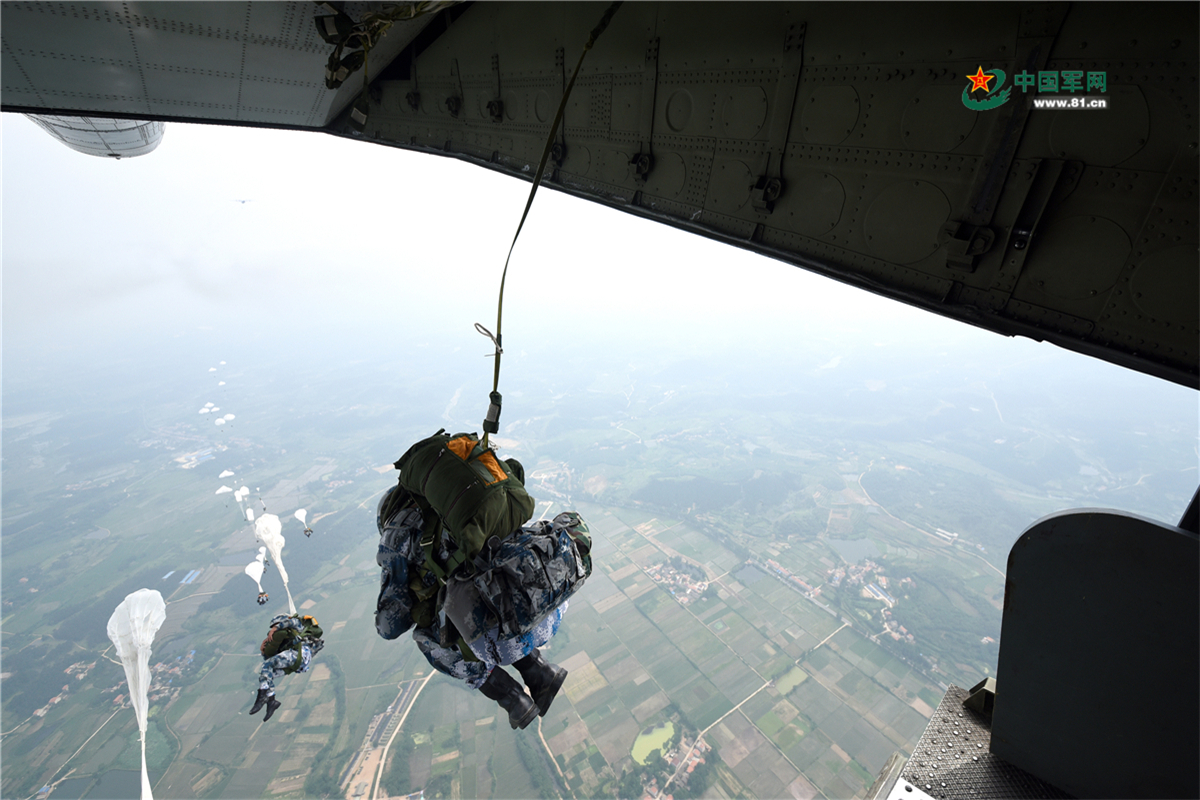 “跳!跳!跳!”经过长途空中机动,飞机准时到达预定空域,在制空火力掩护下,部队实施多批次集群伞降和物资空投,一瞬间天空中朵朵伞花绽放。