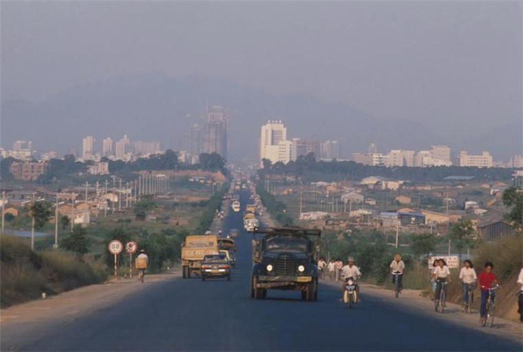 1985年,深圳的深南大道仍然是一条狭窄的柏油路,路上车辆稀少。如今腾讯等知名科技企业总部都在这条路周围。(摄影:安哥 /FOTOE)