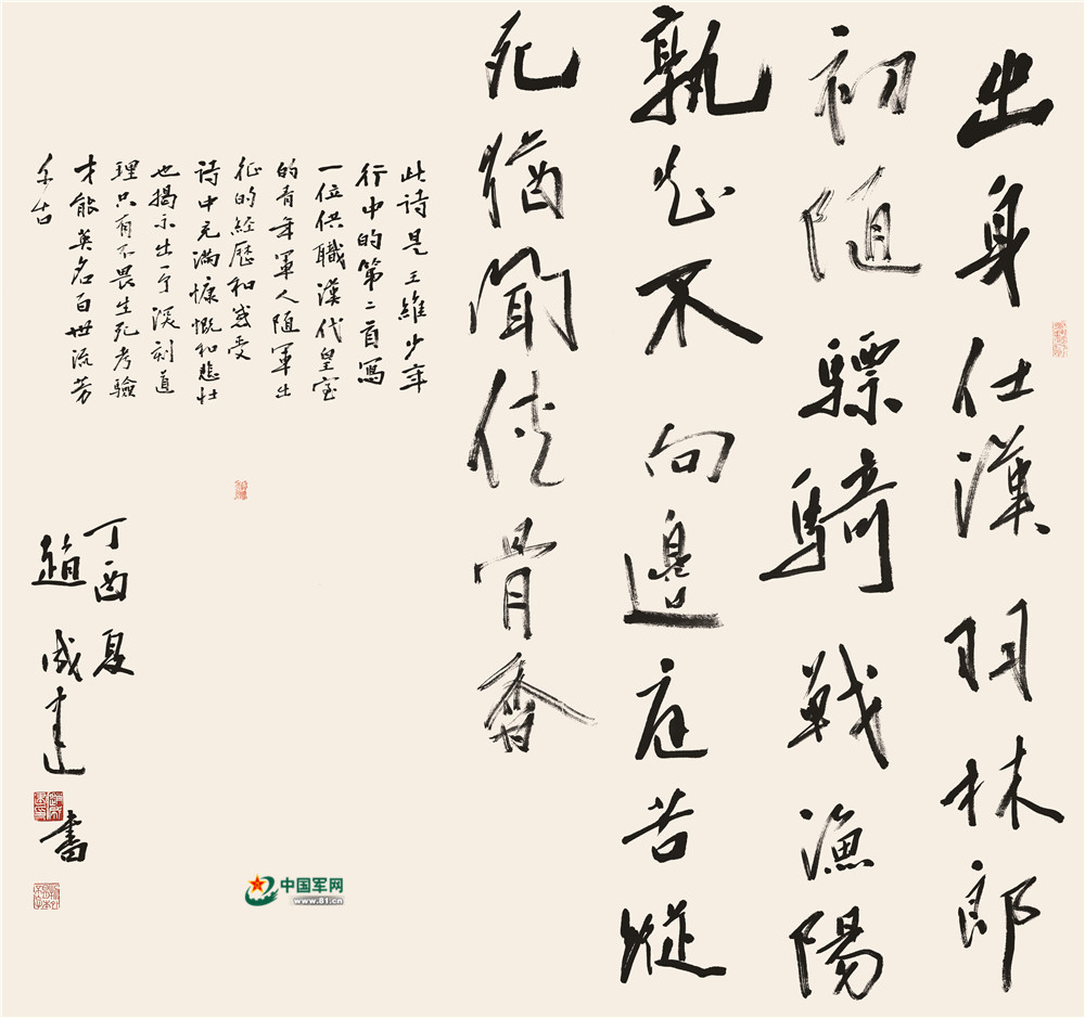 此诗是王维《少年行》中的第二首,写一位供职汉代皇室的青年军人随军出征的经历和感受,诗中充满
