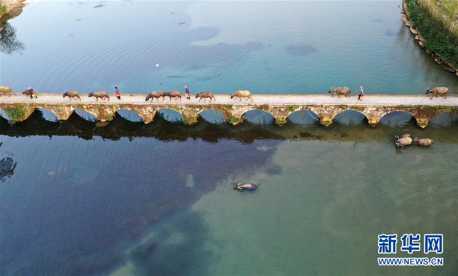 广西百色靖西市新靖镇鹅泉村村民从古老的石桥上赶牛回村(11月27日无人机拍摄)。