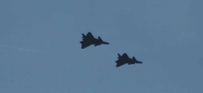 歼-20以箭形密集队形进场,先后完成双机低空盘旋、单机战斗转弯等飞行动作。