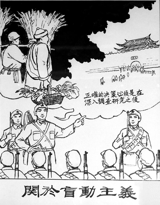 这幅关于盲动主义的宣传画直接点明 “正确的决策必须是在深入调查研究之后”这一道理。红四军专门作出规定,要求红军每到一处,就应分散到群众中去,对当地作政治经济和阶级状况的调查,以便为制定符合当地实际情况的工作方针与策略提供材料。