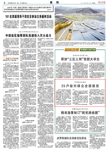 3月20日,空军航空兵某旅官兵来到辽宁省丹东市宽甸县牛毛坞镇小城子村了解脱贫工作进展,村党支部书记胡仁智说出了群众的愿望。带队的该旅政委于文科当场表态:“请乡亲们放心,村里要修致富路我们一定帮忙!”