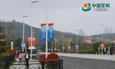 青岛汇泉广场外,灯杆上悬挂着庆祝海军成立70周年的标语。 中国军网记者王超 摄