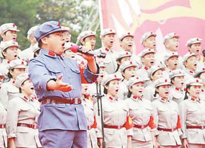 江西省于都县长征源合唱团是由160余名红军后代、歌唱爱好者组成的业余团队。图为合唱团在义演。本报记者 夏康健 朱 磊摄影报道