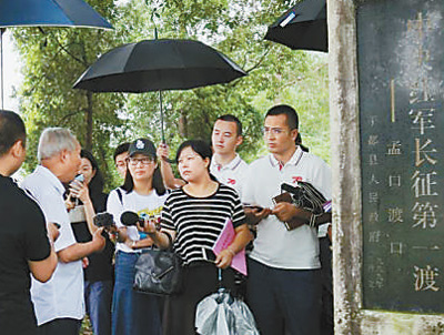 6月12日,记者在江西于都县罗坳镇孟口村孟口长征渡口,冒雨采访中央红军第八军团集结渡河的故事。人民网记者 秦海峰 艾 鑫摄影报道