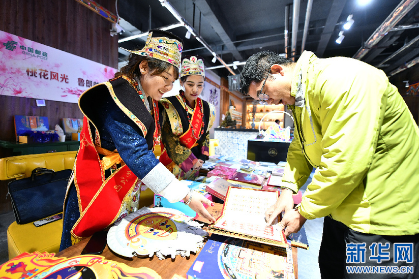 4月1日,一名顾客(右)在首家全国援藏文旅连锁超市内选购西藏特色邮品。新华社记者 李鑫 摄