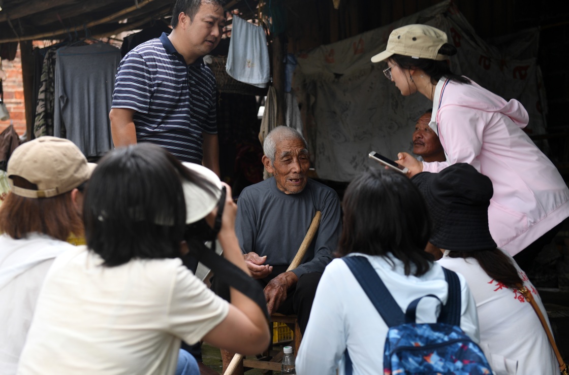 蒋济勇老人(中)在向记者讲述红军渡过湘江的故事(6月29日摄)。新华社记者 陆波岸 摄