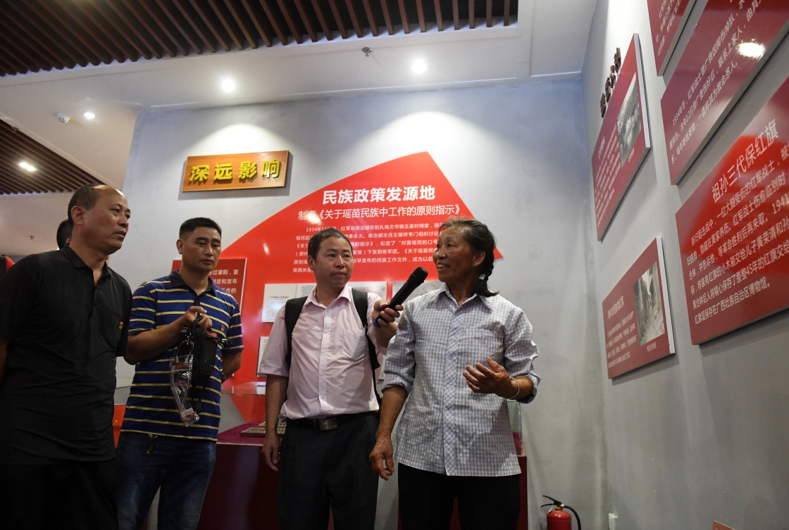 在广西灌阳县新圩阻击战陈列馆前,故事主人公黄合林的曾孙媳妇李青鸾老人(右一)向参观者讲述保护红旗的故事(6月28日摄)。新华社记者陆波岸 摄