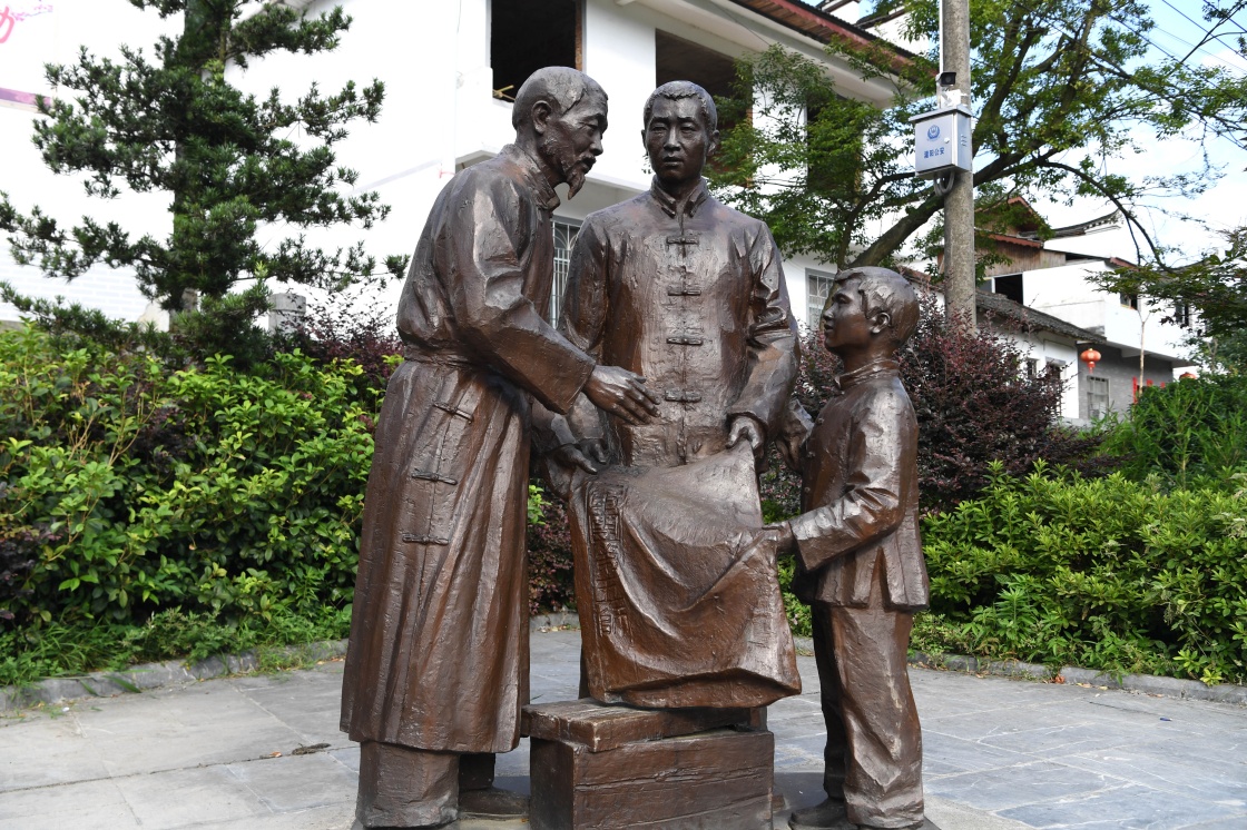 这是广西灌阳县新圩阻击战陈列馆前广场上的祖孙三代保红旗的雕塑。从左至右依次是黄合林、黄荣清、黄光文(6月28日摄)。新华社记者周华 摄