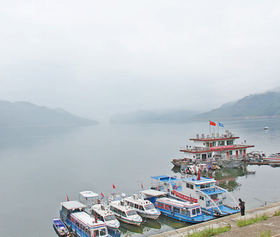 暴雨停歇,水雾升腾,江面犹如轻纱笼罩。眺望远处群山,灰蒙蒙尽失颜色,对岸岩壁上四个红色大字更加夺目——“乌江天险”。