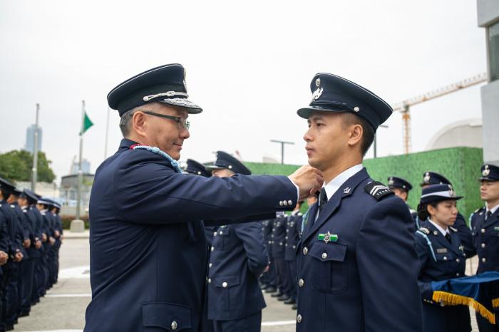 黄有力关长为晋升人士戴上新肩章。图片来源:澳门特区政府网站
