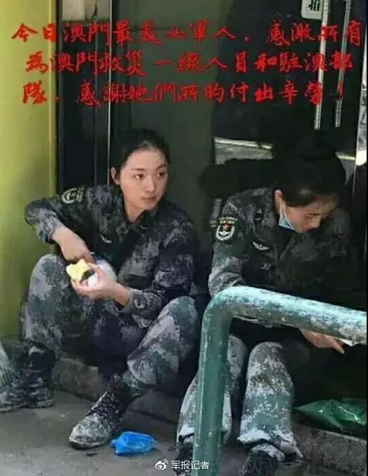 在那场救援中,驻澳门部队女兵管刘寒和裴莹意外成了“网红”——她们在救援间隙坐在路边休息的照片,在那一年成了网络热搜,许多人称赞她们是“澳门最美女兵”。