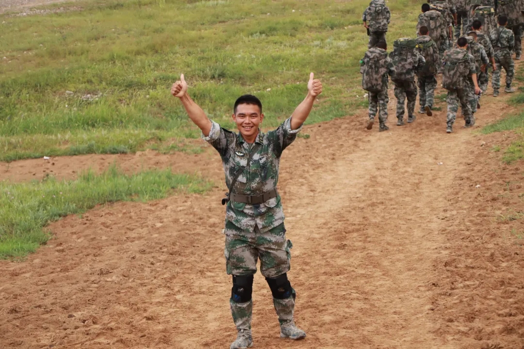 100公里野营拉练,每名官兵负重30多斤,头顶烈日、脚踏黄沙,汗水浸透了衣裳、脚底磨出了水泡、背囊也磨破了双肩……但官兵们都咬牙坚持,斗志不减,昂首阔步,紧跟队伍,坚决不掉队。战士朱唐军的笑容定格在这个瞬间。
