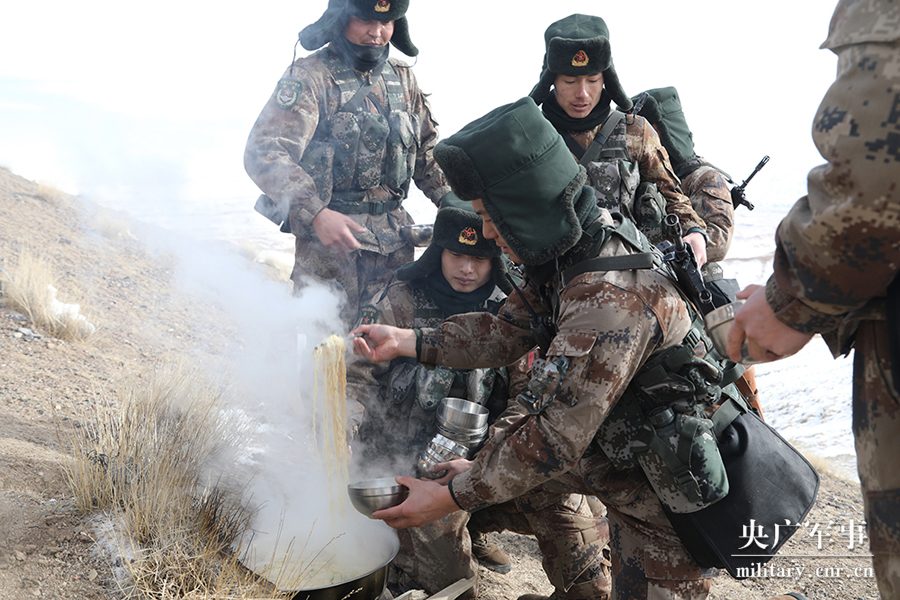 张瑜和战友说,巡逻路上,其实他们最开心的就是吃上一碗煮面。“你看现在气温零下二十多摄氏度,天寒地冻,吃上一碗面,喝上一碗热腾腾的汤,暖暖身子多好。”