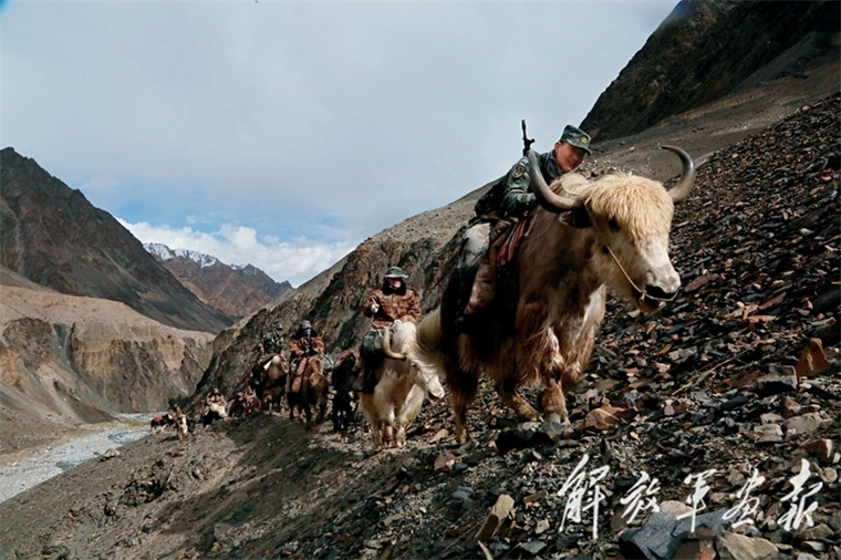 官兵骑着牦牛在碎石满地的山坡上艰难前行。资料图