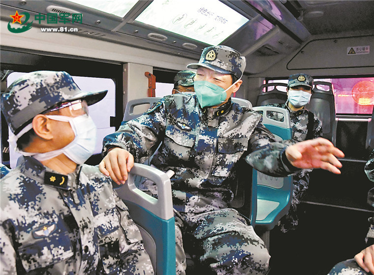 在从火神山医院到驻地的班车上,张西京(左二)与同事交流治疗经验。