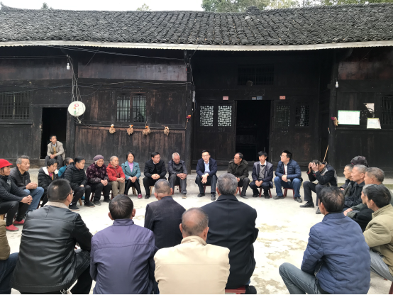 姜超(左十一)在玉屏县皂角坪街道铁家村召开院坝会,交流战胜贫困的办法与措施。