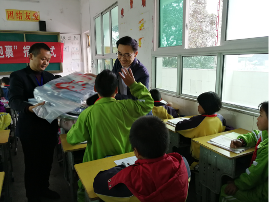 姜超(右一)为玉屏县朱家场镇兴隆小学学生发放来自太仓的“爱心包裹”。