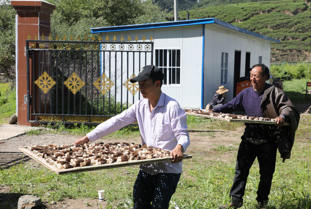7月1日,在甘肃省甘南藏族自治州合作市勒秀镇邓英高村的羊肚菌种植基地,村民端着羊肚菌准备放置到烘干炉上。新华社发(张智敏 摄)