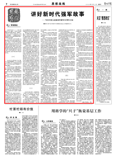 “宏大叙事”的中国梦强军梦,也是“具体而微”的个人梦。我们每名官兵都是“梦之队”的一员,都是强军梦的参与者,都是新时代强军故事的书写者。让我们携起手来,增强“四个意识”、坚定“四个自信”、做到“两个维护”,贯彻军委主席负责制,为新时代强军故事演绎下一个更为恢宏壮丽、更加激动人心的历史活剧!