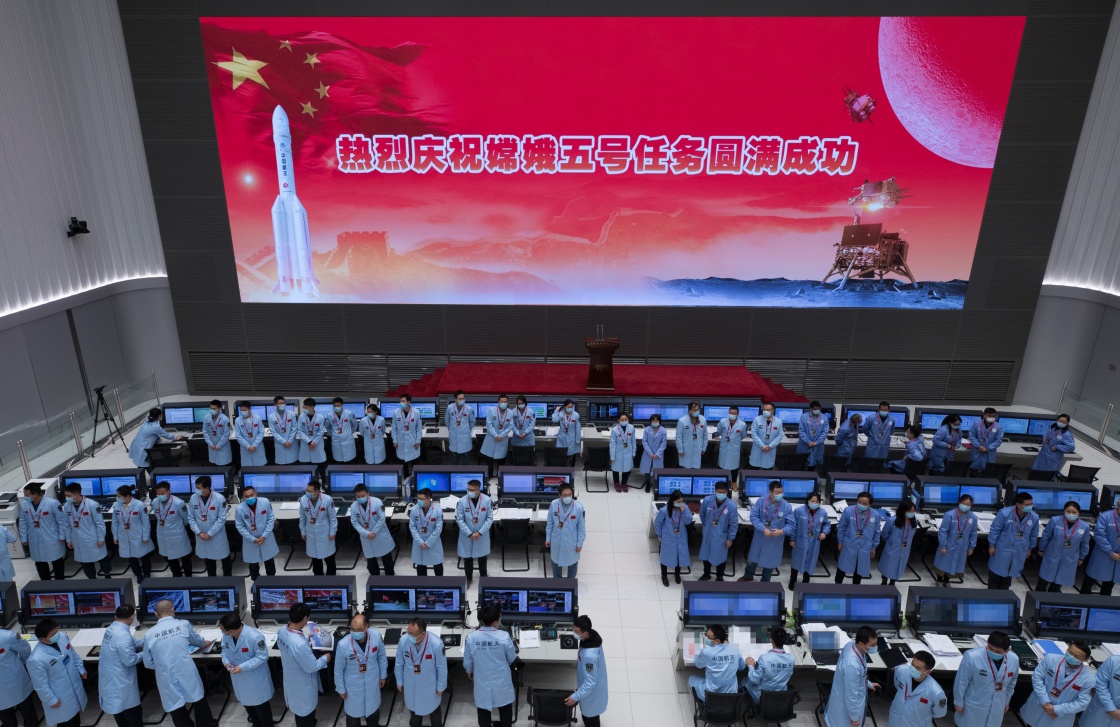 12月17日,工作人员在北京航天飞行控制中心嫦娥五号任务飞控现场观看返回器携带月球样品安全着陆。新华社记者 岳月伟 摄