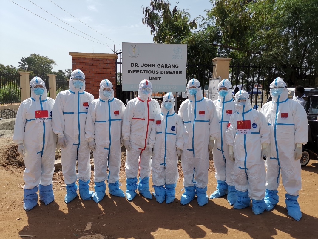 2020年8月21日,中国抗疫医疗专家组成员在南苏丹首都朱巴的一处新冠肺炎治疗机构留影。新华社发(中国驻南苏丹大使馆供图)