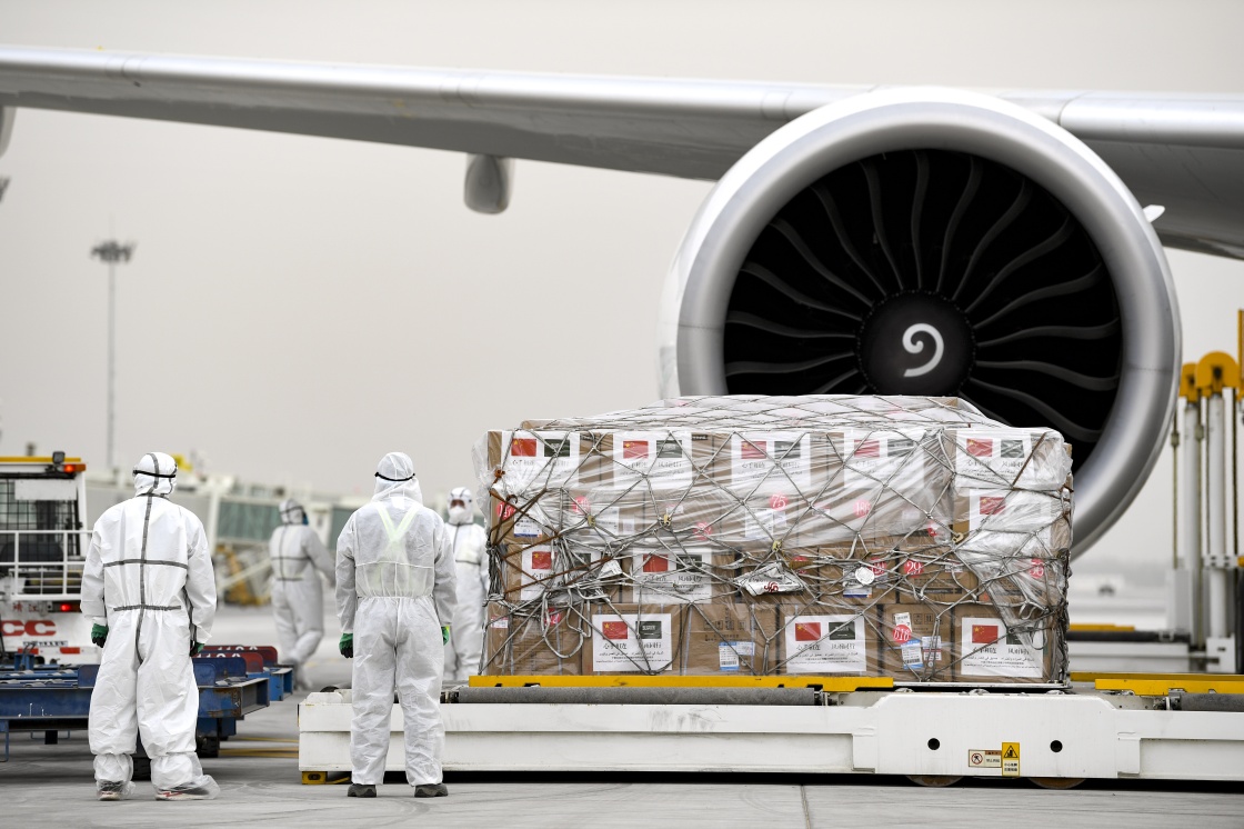 2020年4月15日,工作人员在装运援助沙特阿拉伯的医疗物资。新华社记者 冯开华 摄