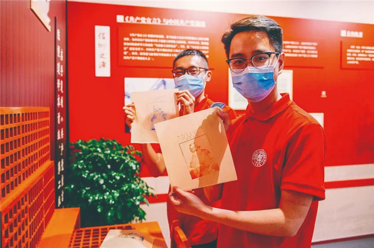 1920年,复旦大学老校长陈望道翻译首个中文全译本《共产党宣言》。2018年5月,复旦大学修缮了陈望道旧居,以“信仰之源”为主题打造《共产党宣言》展示馆,融宣传教育、社会实践、学术培养为一体。一批复旦青年师生党员自发追寻“真理的味道”,组建了党员志愿服务队,面向广大师生和社会各界开展宣讲活动。图为志愿服务队队员在展示《共产党宣言》陈望道译本首版和第二版的复制封面纪念品。(资料图片)
