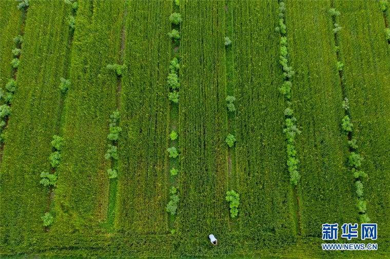 2020年6月23日,在四平市梨树县孤家子镇,忠元种植农民专业合作社理事长宋忠元查看小冰麦长势(无人机照片)。新华社记者 张楠 摄
