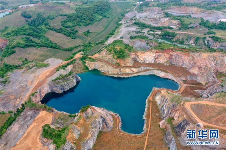 在四平市梨树县孟家岭镇马家油坊村,实施矿山复绿生态修复工程后形成的“小天池”景区(2020年6月22日摄,无人机照片)。新华社记者 张楠 摄