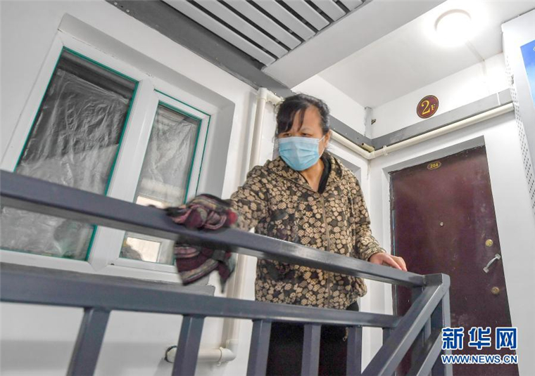2020年4月22日,在四平市铁东区东星社区东兴小区,居民高静打扫改造完毕的楼道。新华社记者 张楠 摄