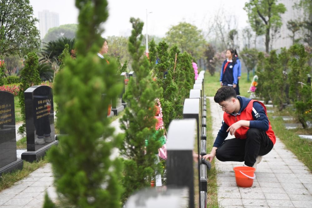 3月30日,志愿者在湖南革命陵园擦拭墓碑。