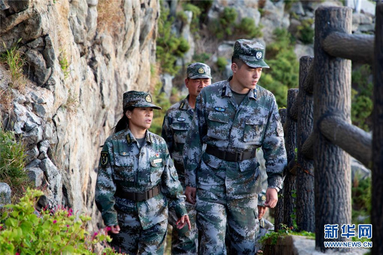 在江苏省连云港市灌云县开山岛,王仕花(左)、民兵哨所所长陈志显(右)和轮值民兵一起巡逻(2020年9月27日摄)。新华社记者 刘芳 摄