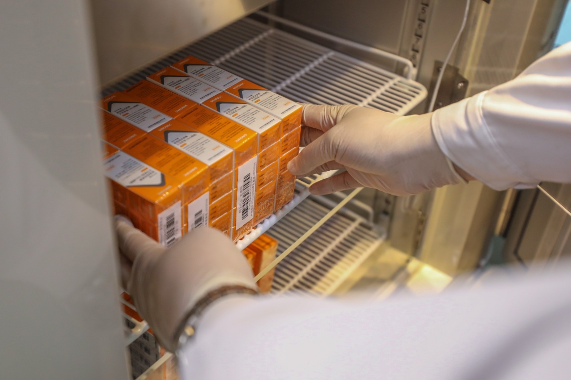 4月7日,医护人员从移动疫苗接种车上的冷藏箱内取出新冠疫苗。