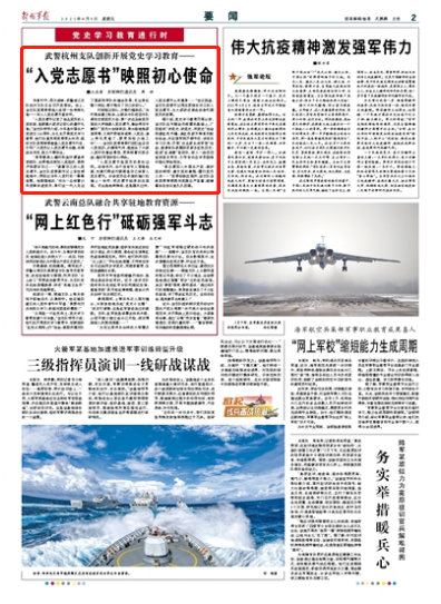 据介绍,党史学习教育开展以来,该支队在专题动员部署的基础上,广泛组织“学党史、讲党史、用党史”活动和读红色书籍、诵红色家书等系列配合活动,并在强军网开辟专栏,供官兵学习交流;开展“百名家长进军营”活动,邀请官兵家属讲述家乡红色历史;组成“红肩章”宣讲队,深入一线巡回宣讲党史军史,引导官兵在学思践悟中强化使命担当。