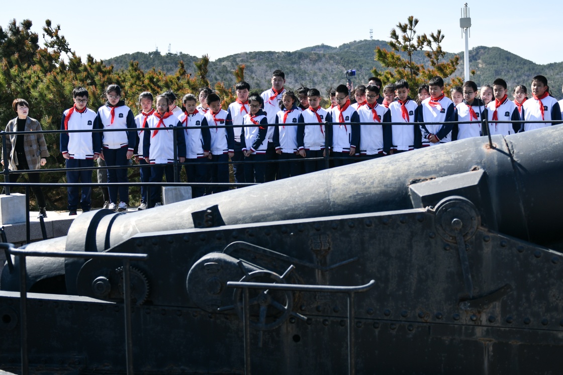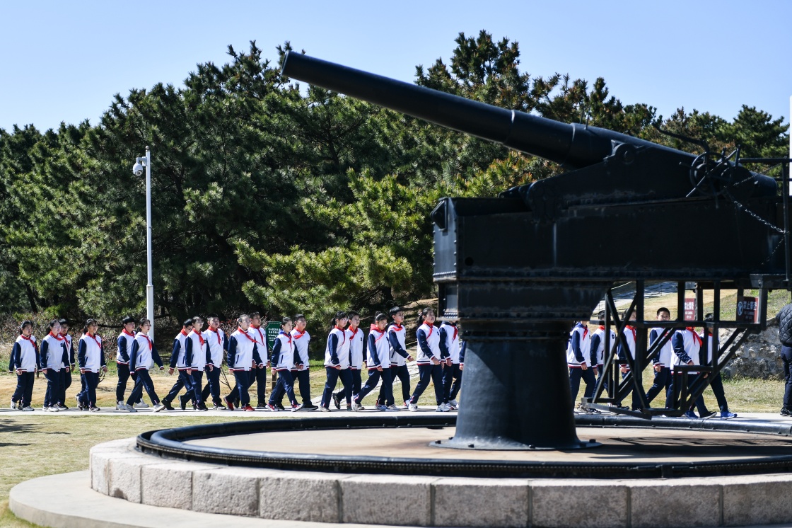 4月13日,学生在总体国家安全观刘公岛教育培训基地参观东泓炮台旧址。新华社记者 朱峥 摄