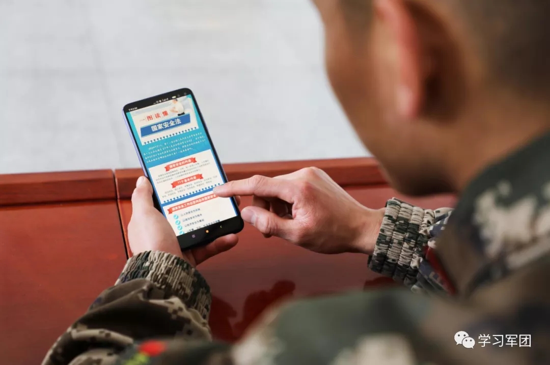 ▲武警甘肃总队机动支队官兵通过手机自学国家安全知识