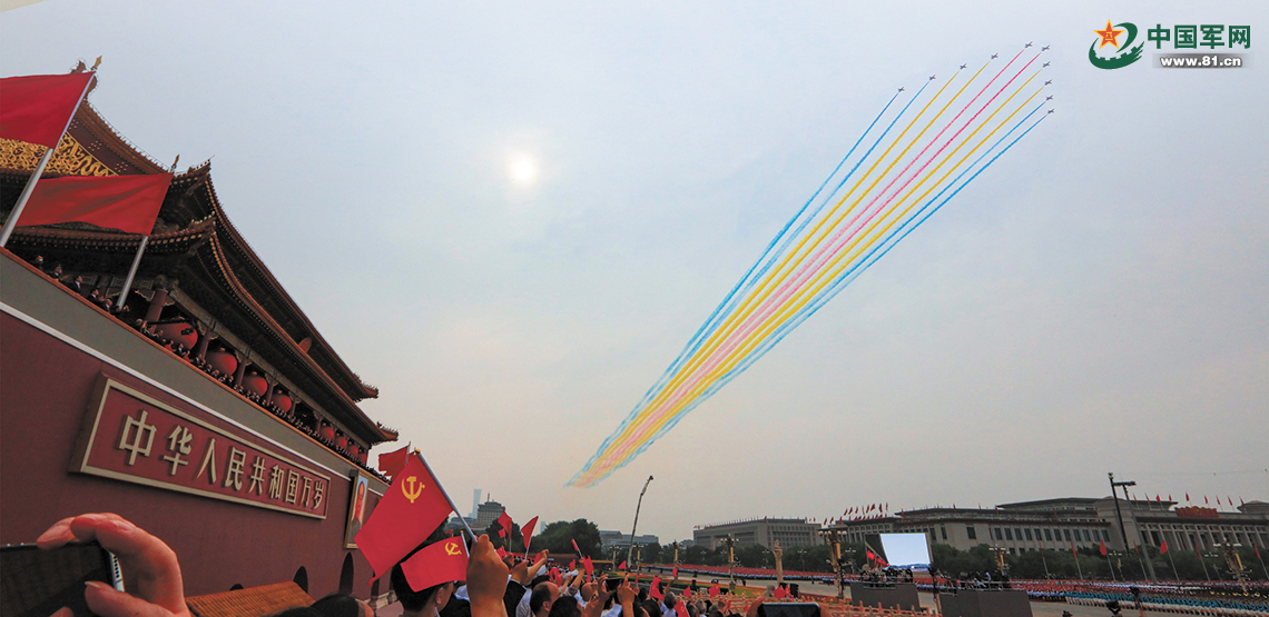 飞行庆祝表演中,教练机拉出10道彩烟飞越天安门广场上空。