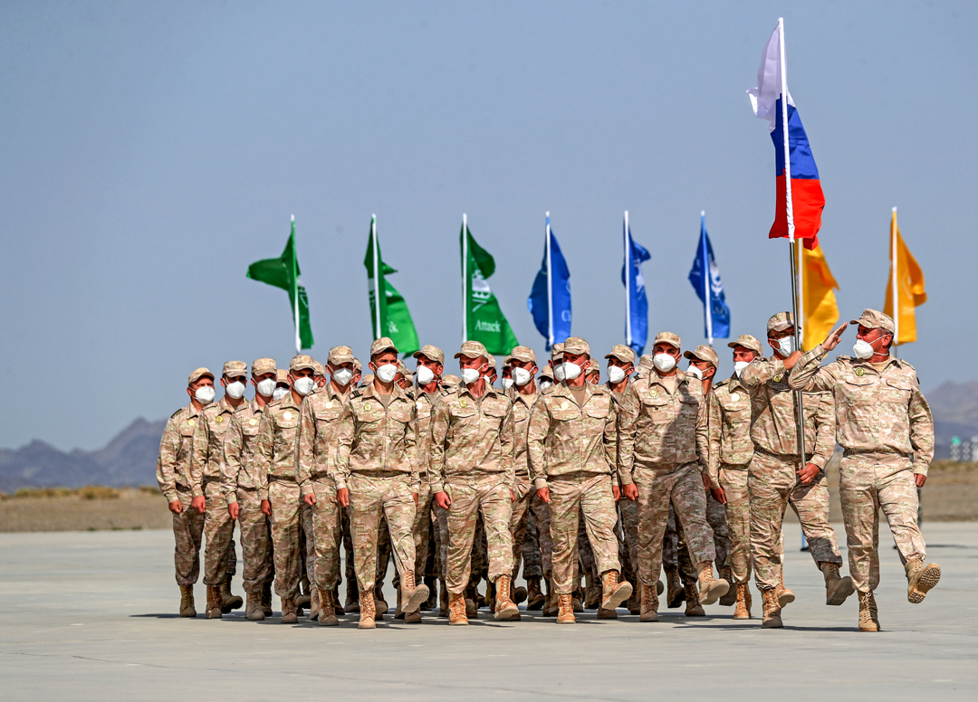 8月22日,“国际军事比赛-2021”中国库尔勒赛区比赛在新疆库尔勒开幕,俄罗斯参赛队走过主席台。 新华社发 罗兴仓 摄