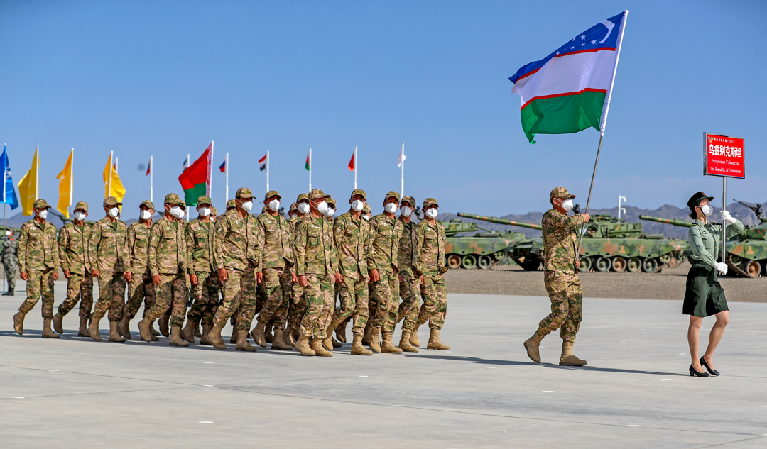 8月22日,“国际军事比赛-2021”中国库尔勒赛区比赛在新疆库尔勒开幕,乌兹别克斯坦参赛队走过主席台。 新华社发 罗兴仓 摄
