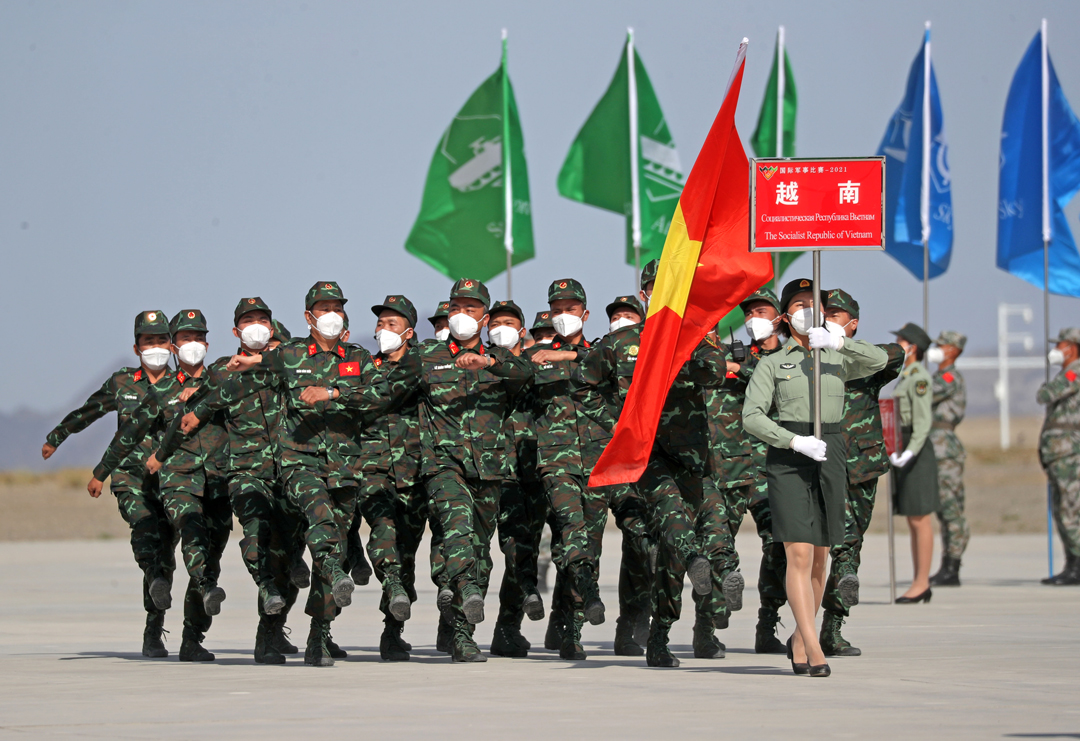 8月22日,“国际军事比赛-2021”中国库尔勒赛区比赛在新疆库尔勒开幕,越南参赛队走过主席台。 新华社发 罗兴仓 摄