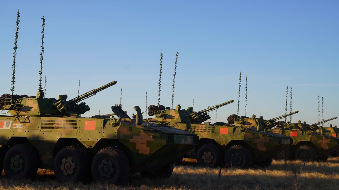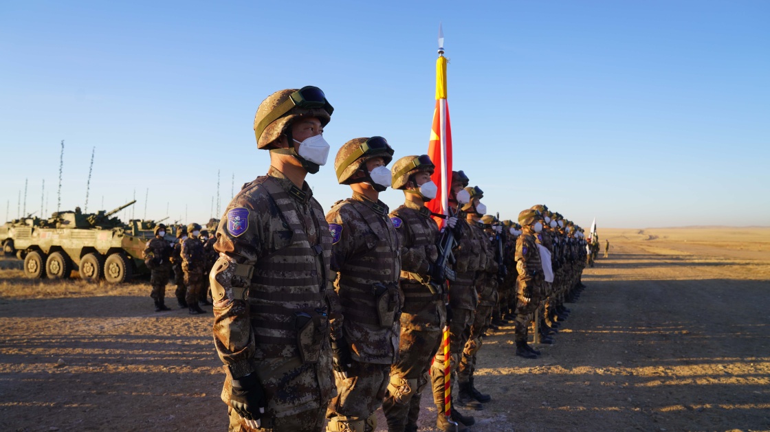 金秋的东古兹草原,天高云淡。各国参演部队官兵全部身着战斗服装,整齐列阵,身后数百台受阅装备在阳光下熠熠生辉。