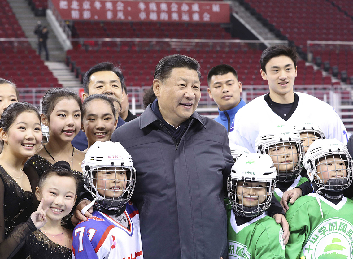 2017年2月24日,在五棵松体育中心,习近平总书记实地察看2022年北京冬奥会冰球比赛场馆,热情勉励青少年冰球和队列滑爱好者们。