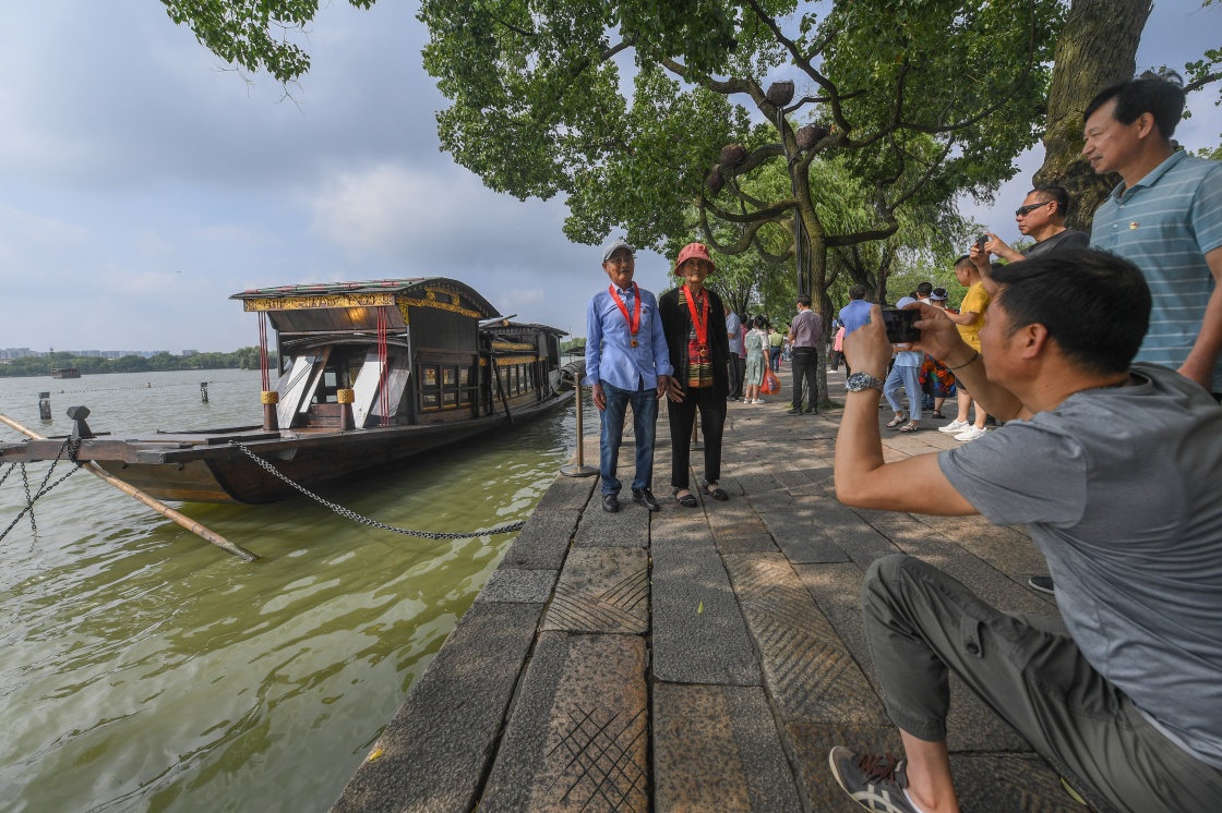 两名老党员在浙江嘉兴南湖湖心岛停泊的南湖红船旁拍照(7月1日摄)。新华社记者 徐昱 摄