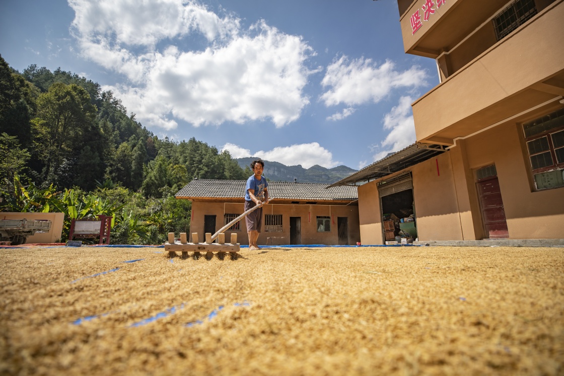10月3日,重庆市酉阳土家族苗族自治县花田乡何家岩村村民在晾晒水稻。新华社记者 黄伟 摄