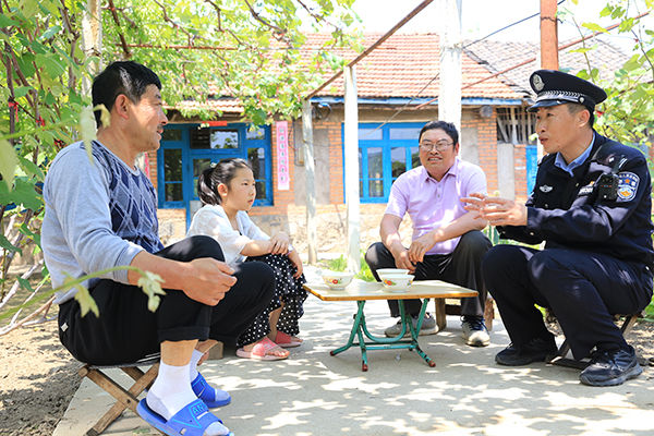 辽宁出入境边防检查总站丹东边境管理支队大江口边境派出所政治教导员李庆峰(右一)在走访村民(2020年5月30日摄)。新华社发