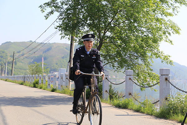 辽宁出入境边防检查总站丹东边境管理支队大江口边境派出所政治教导员李庆峰骑车下片走访(2020年5月30日摄)。新华社发
