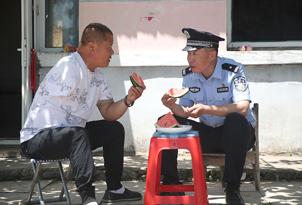 辽宁出入境边防检查总站丹东边境管理支队大江口边境派出所政治教导员李庆峰(右)走访村民陈富宝(2020年6月15日摄)。新华社发